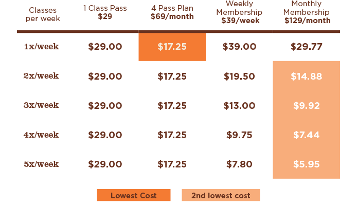 Not sure which package to get? This handy chart breaks down the cost per class for all our pricing options!